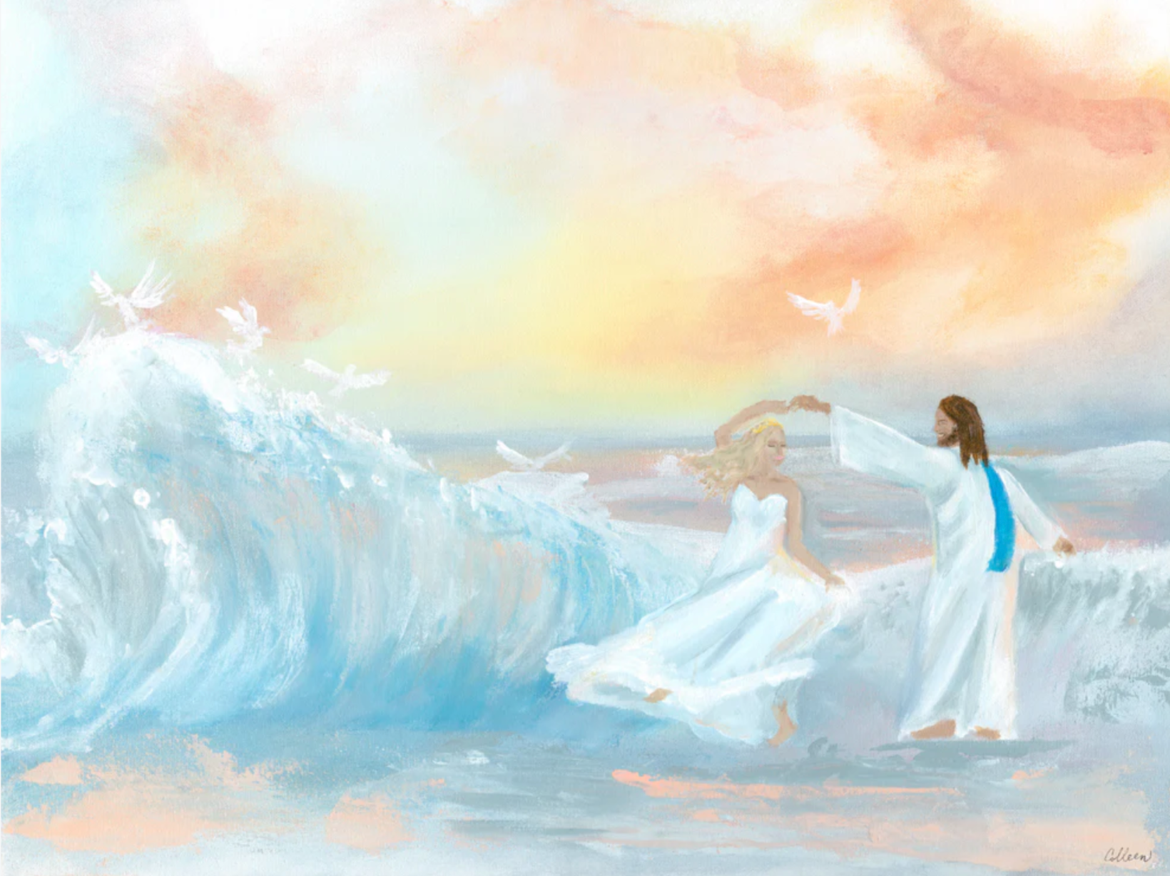 The promise of Jesus coming back for a spotless bride filled me with hope and inspiration, it reminded me of the beautiful relationship between Jesus and His people, where He is the Bridegroom and we are His beloved bride. Let us answer the calling of our Bridegroom and Savior as He invites us to walk on the water and dance freely on the waves with Him. I hope this painting will remind you of the joy and freedom that comes with complete trust in our Creator!